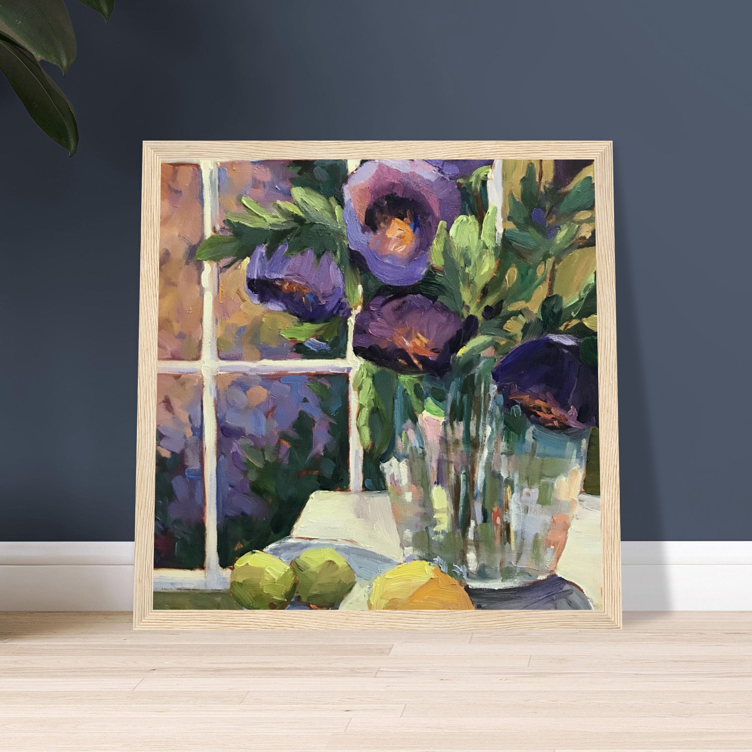 ‘Purple Flowers’ Floral Still | 12x12 inch Wooden Framed Art Print | Original Artwork by American Artist Barbara Cleary