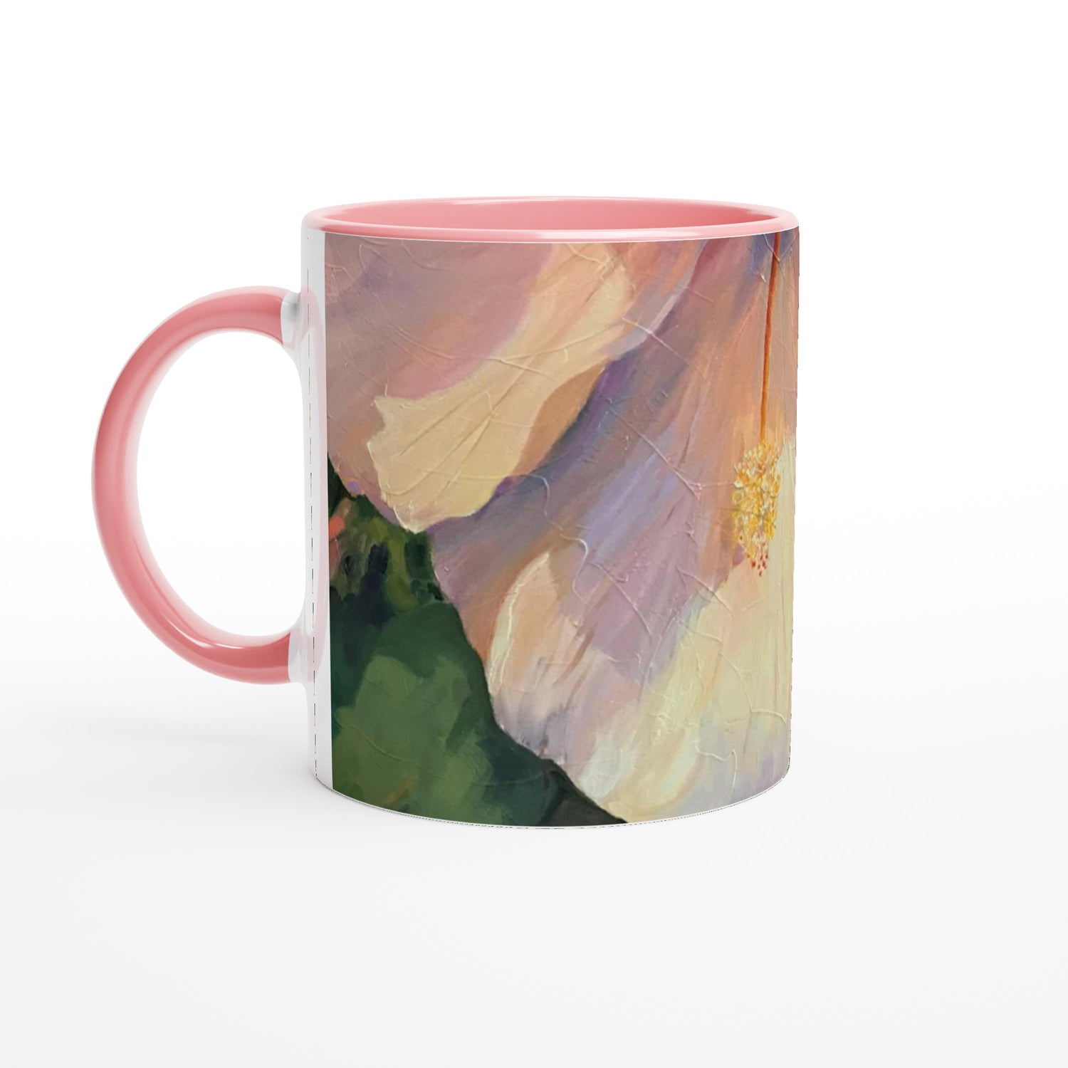 17oz White Ceramic Latte Mug | Coffee Cup with 'Pink Hibiscus' Floral Artwork by American Artist Barbara Cleary
