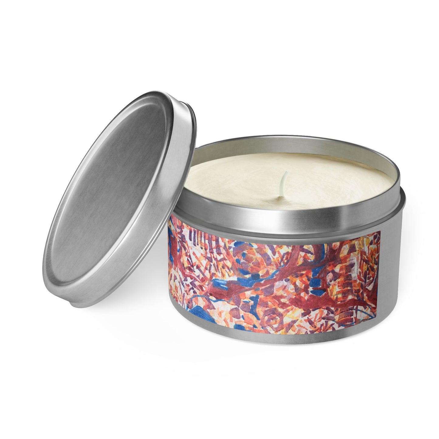 8oz Eco-Friendly Scented or Unscented Soy Wax Tin Candle with 'Abstract Fusion' Abstract Artwork by American Artist Barbara Cleary