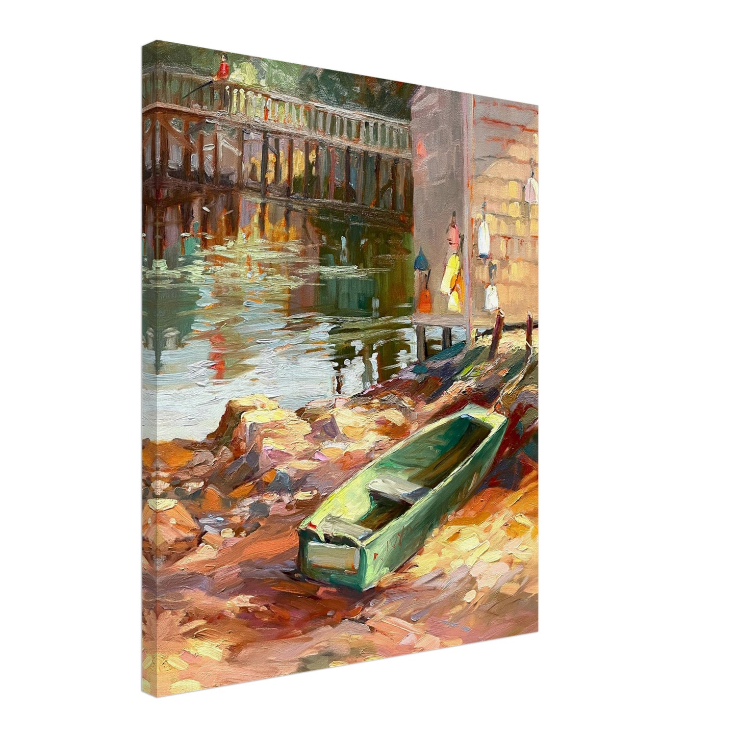 Experience the timeless beauty of Barbara Cleary’s coastal oil painting, "Boathouse Reflections," now available as a high-quality 20x24 inch canvas print. This stunning artwork captures the serene essence of a boathouse scene, beautifully reflecting the vibrant colors of the water and the surrounding landscape. The canvas texture enhances the painting’s natural look and feel, offering an immersive art experience that brings this tranquil scene to life.