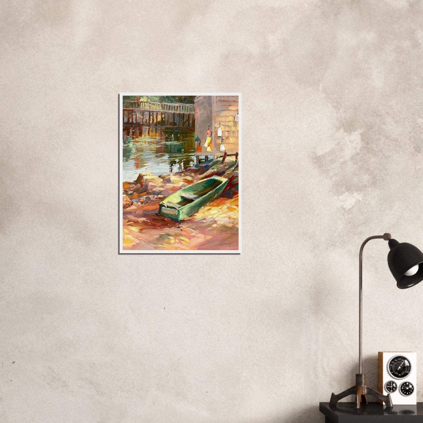 Framed Poster of Barbara Cleary's Coastal Oil Painting, "Boathouse Reflections" – 18x24 Inches