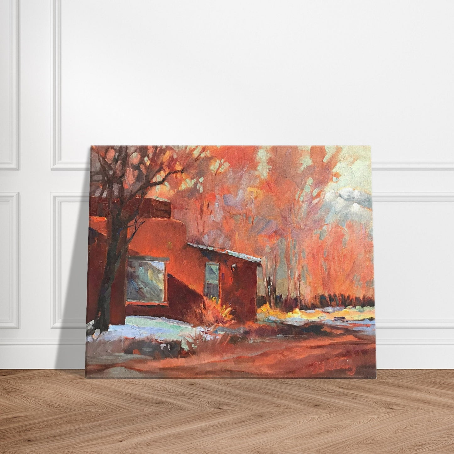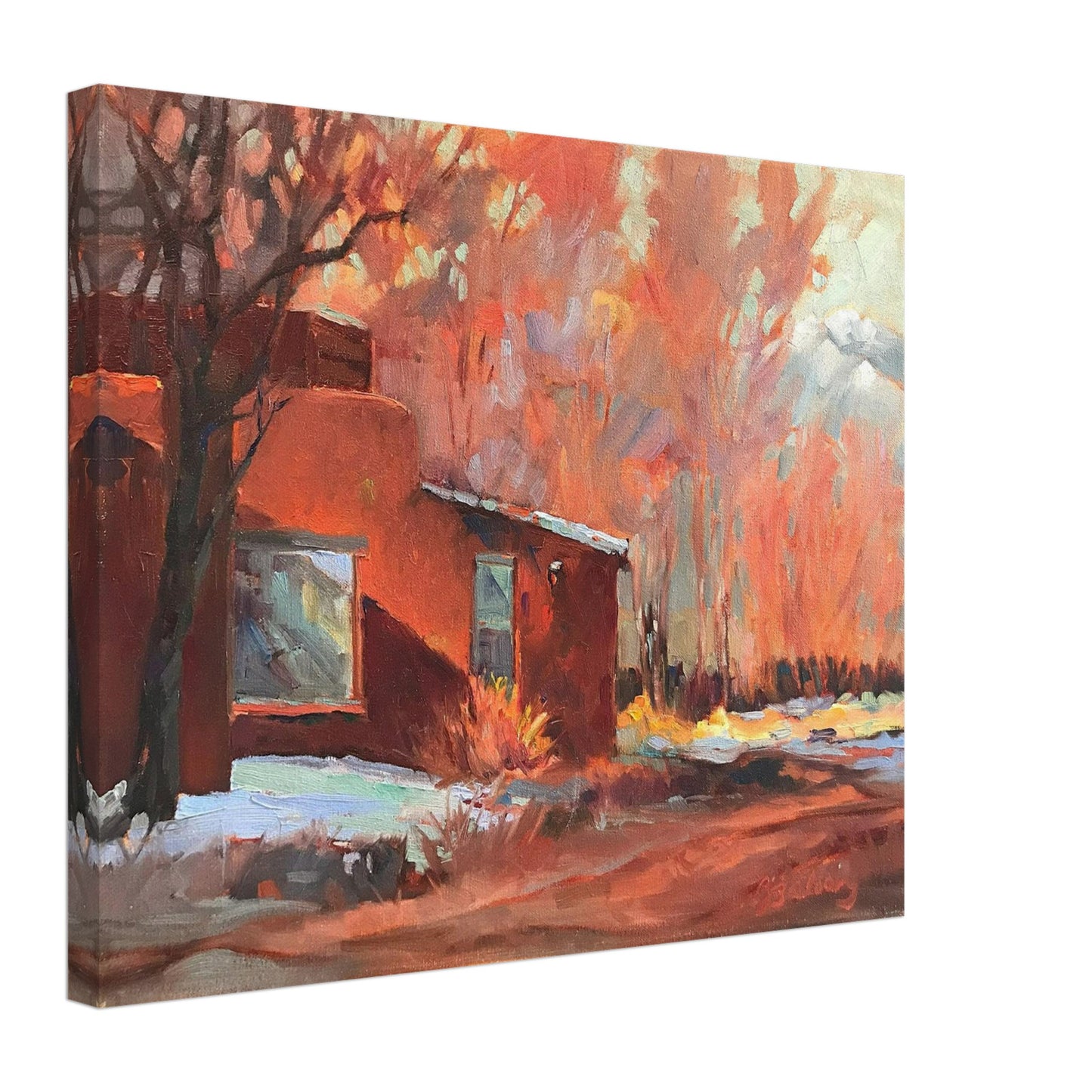 Step into the radiant heart of Taos’ artistic legacy with Barbara Cleary’s oil painting, Dodge House. Now available as a 16x20 inch gallery-wrap canvas print, this warm-toned masterpiece captures the iconic adobe silhouette of the historic Mabel Dodge Luhan House, glowing in hues of fiery red and orange. With expressive brushwork and reverent color, Cleary channels the timeless spirit of a place where art, culture, and creative revolution once converged.