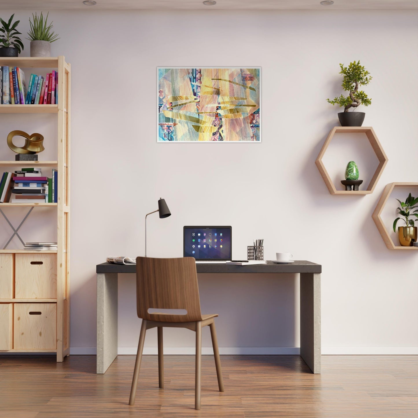 Elevate your decor with the dynamic elegance of our ready-to-hang wooden framed poster featuring Barbara Cleary's captivating watercolor painting, "Loom Series." This 20x28 inch print is crafted on our master's edition archival museum-quality paper, showcasing a vibrant interplay of colors and forms that adds a sophisticated touch to any space.