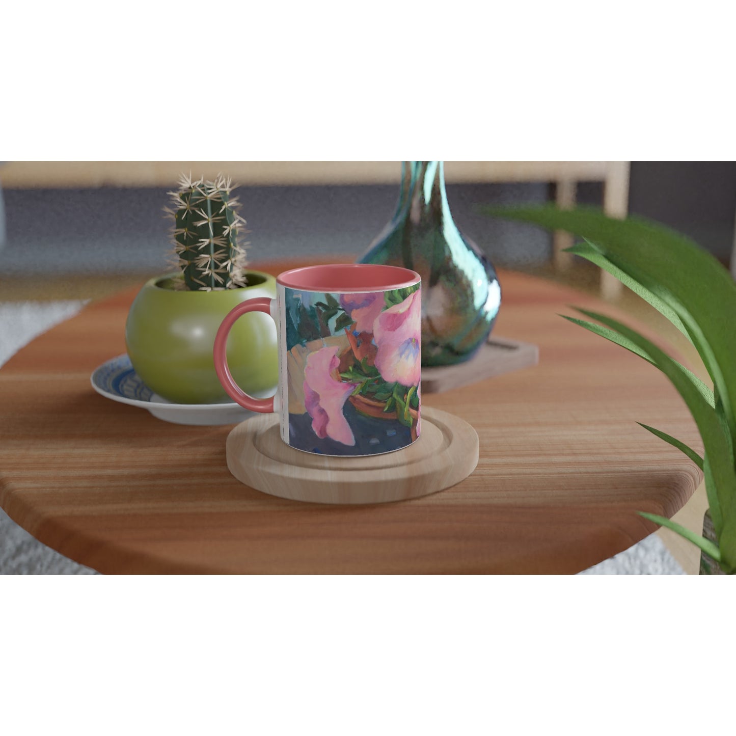 'Pink Petals in Bloom' 11oz White Ceramic Mug with Color Inside | Coffee Cup with 'May's First Born' Floral Artwork by American Artist Barbara Cleary