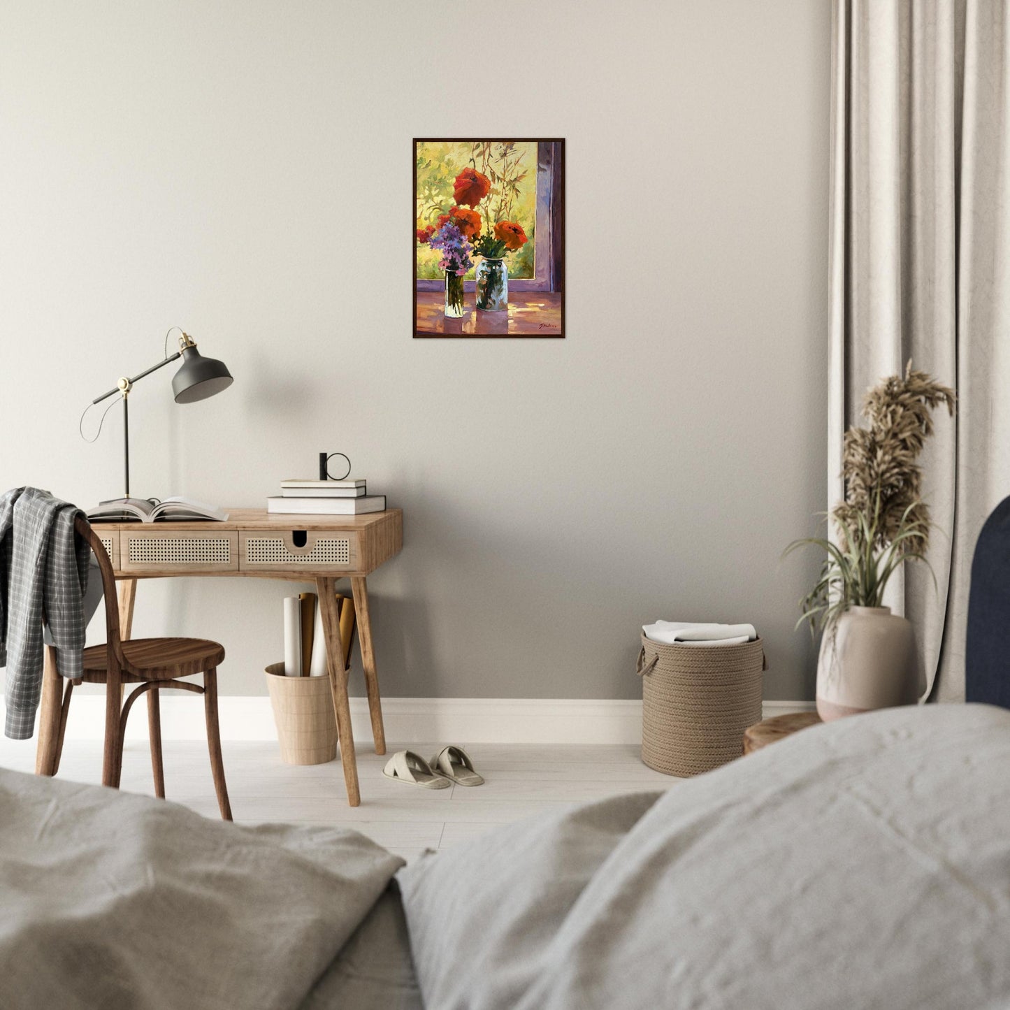 Transform your space with the radiant beauty of our ready-to-hang wooden framed poster featuring Barbara Cleary's stunning oil painting, "Morning Light Poppies." This 18x24 inch print is crafted on our master's edition archival museum-quality paper, showcasing the vibrant red poppy flowers bathed in soft morning light, adding a fresh and inviting atmosphere to any room.