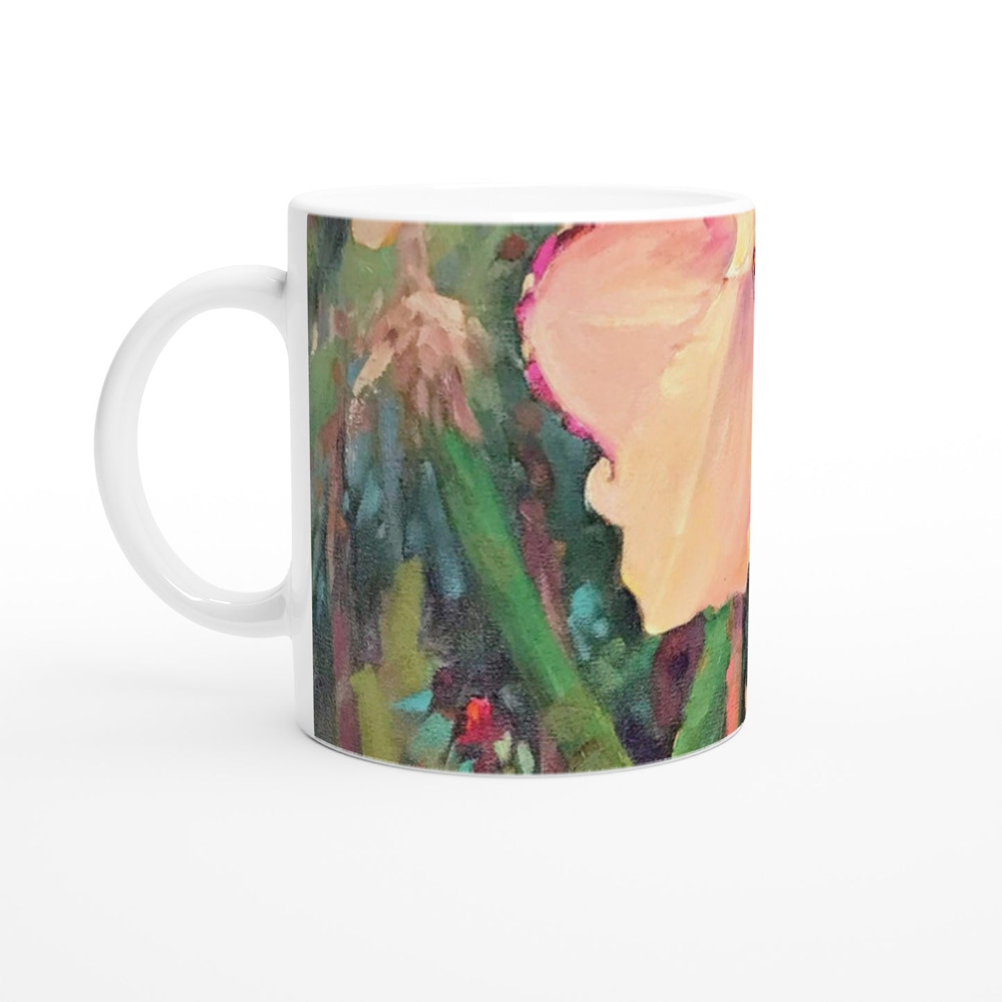 Artistic Design: The mug’s glossy white surface beautifully presents Cleary's "Orchid" oil painting. The vibrant colors and intricate details of the artwork are vividly displayed, enhancing your beverage experience.
