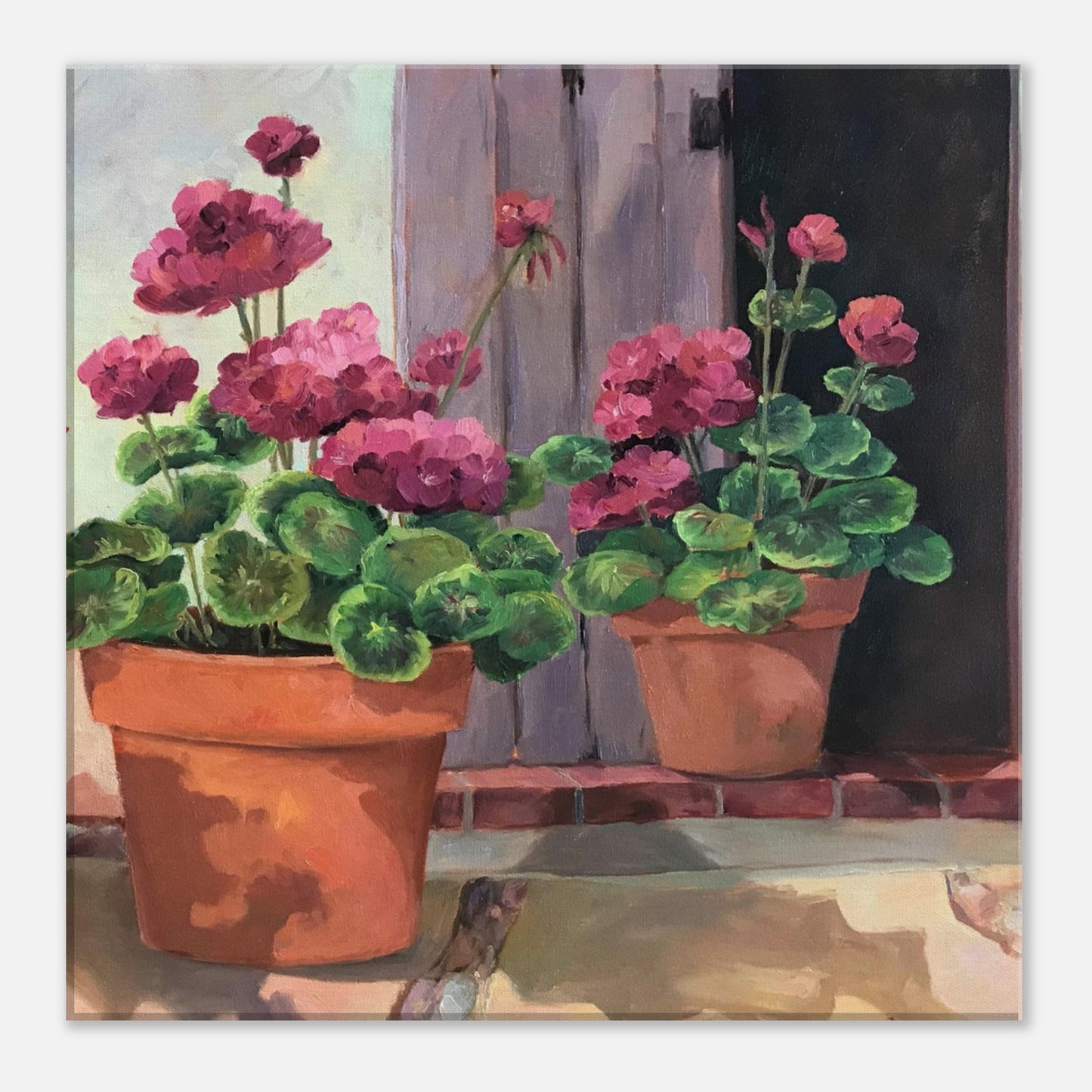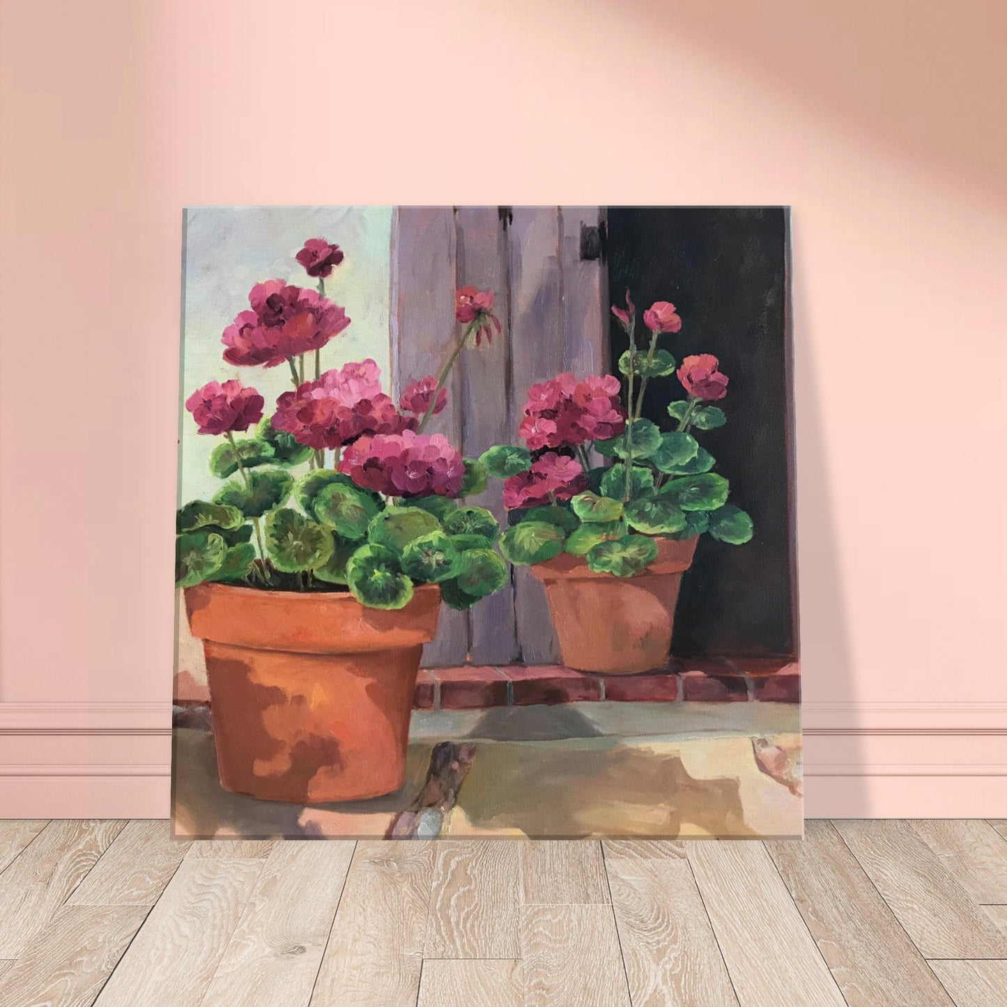 Experience enhanced texture and timeless beauty with our 16x16 inch canvas print of Barbara Cleary's oil painting, "Potted Pink Geraniums Series 2". The canvas texture enhances the image's natural look and feel, creating a truly immersive art experience.