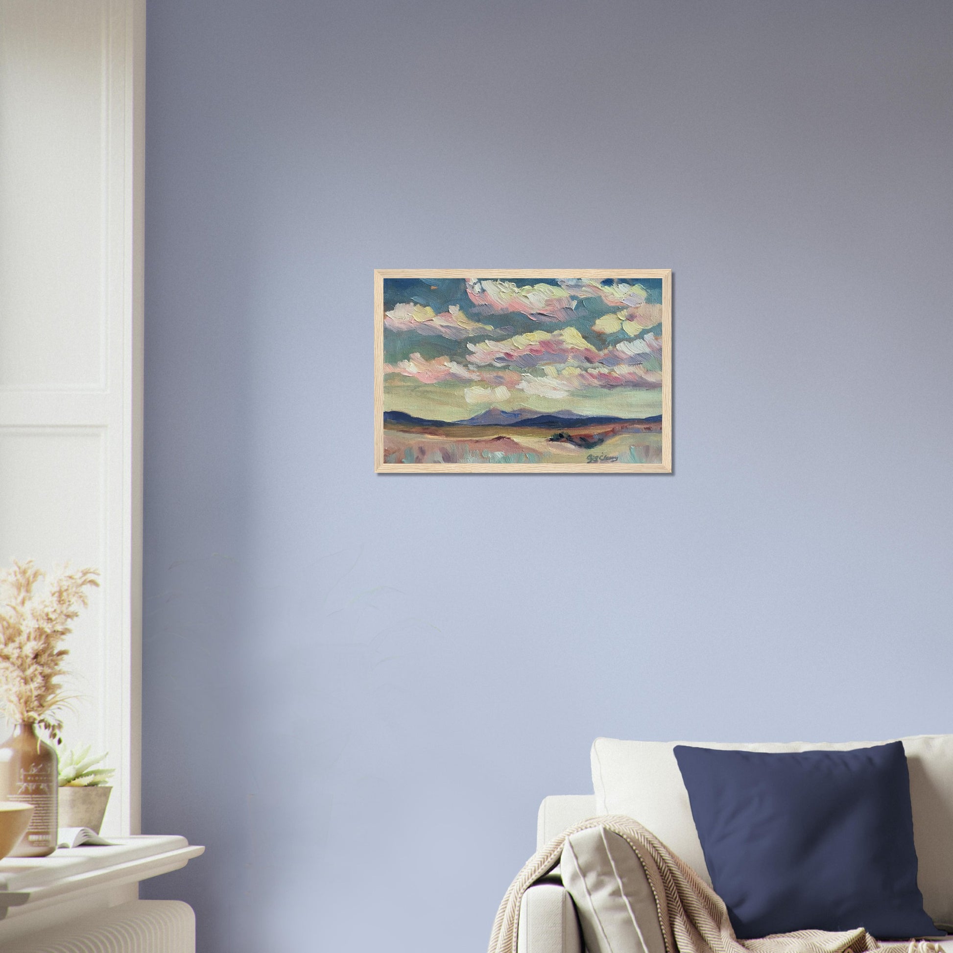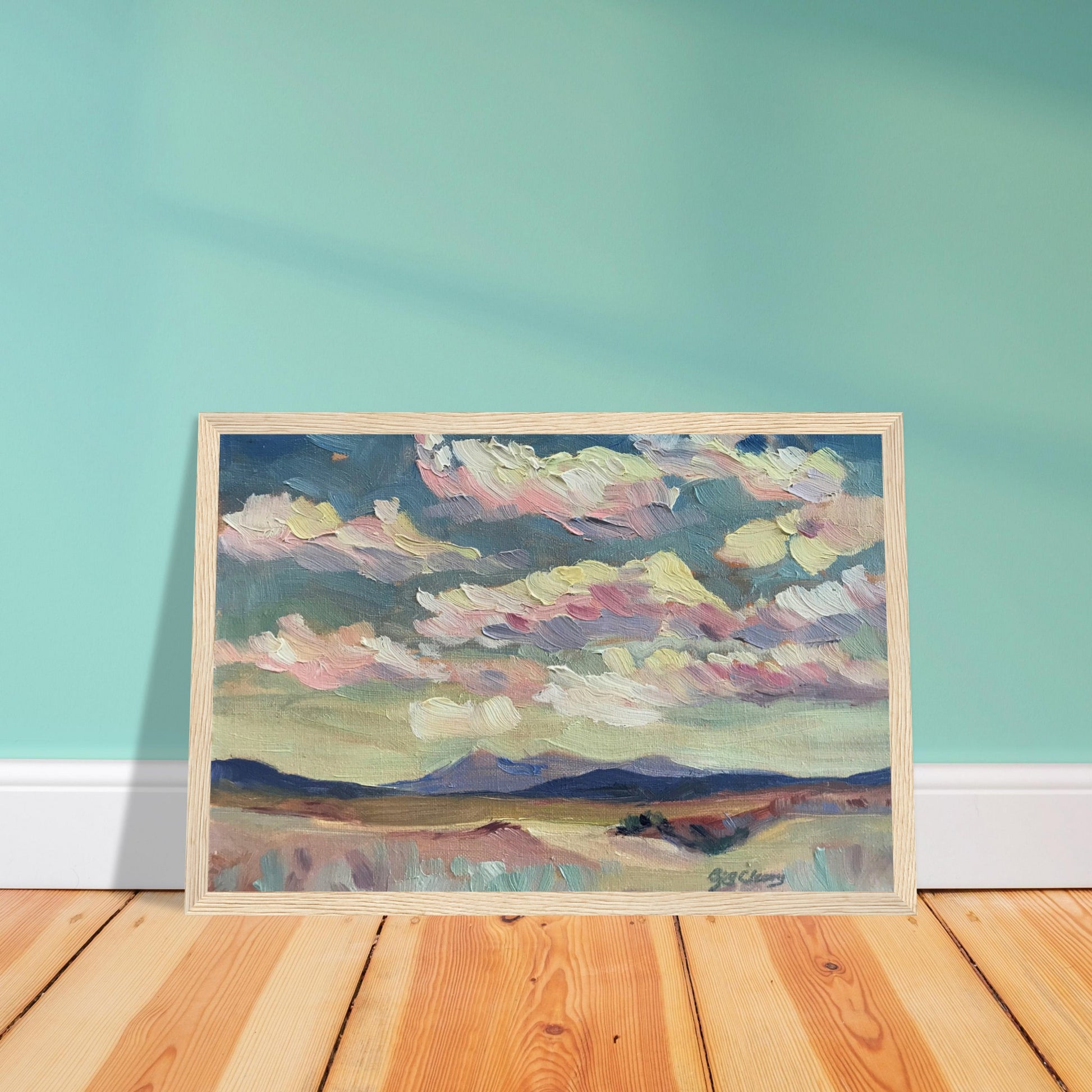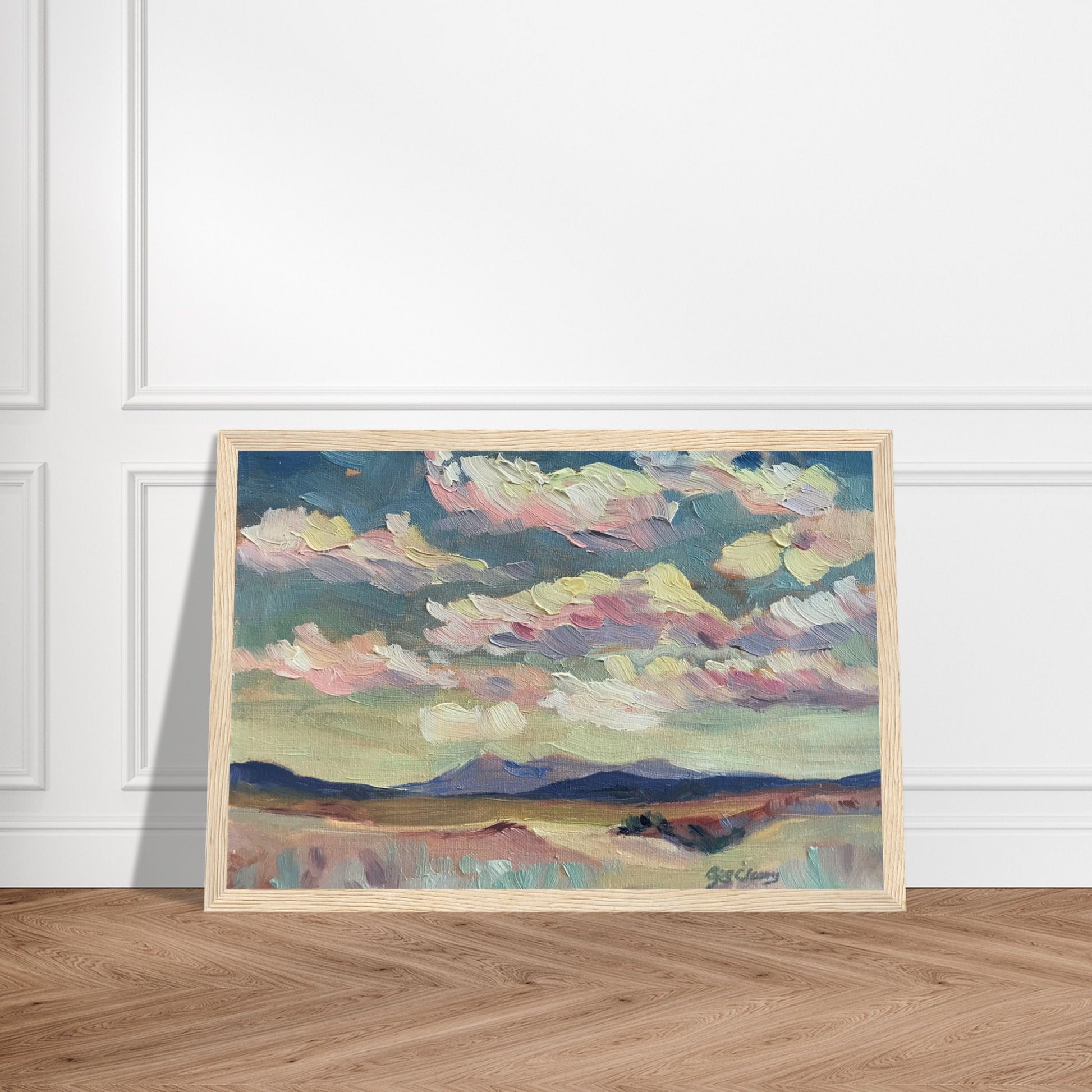 Add timeless charm to your home with the "Rio Chama" fine art poster, a captivating vintage oil painting by Barbara Cleary. This ready-to-hang framed print captures the majestic beauty of big sky vistas and the tranquil elegance of the desert wall art landscapes of the Southwest. Perfect for those who love western décor, this piece combines rustic appeal with a refined vintage aesthetic, making it an excellent addition to any living room décor or gallery wall.