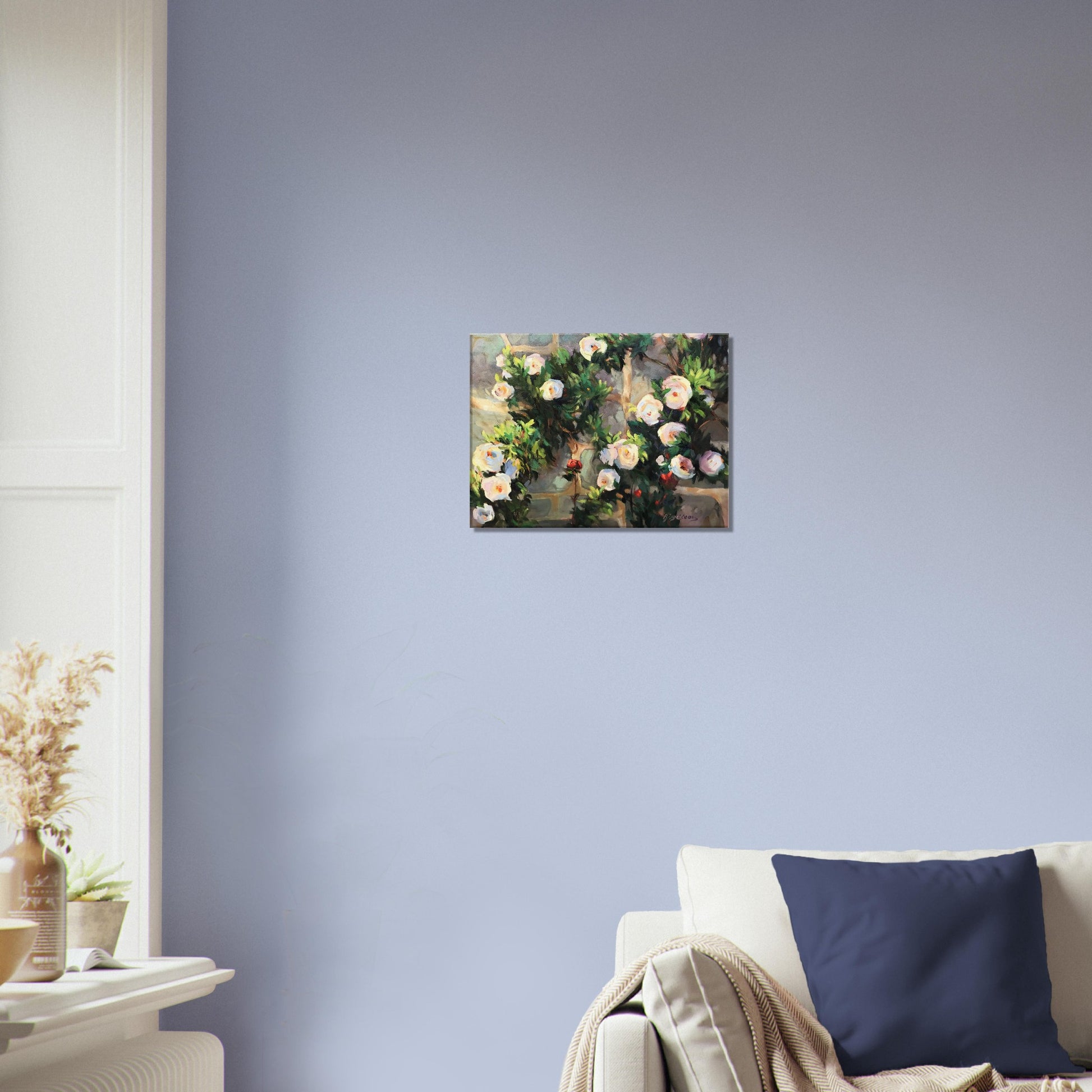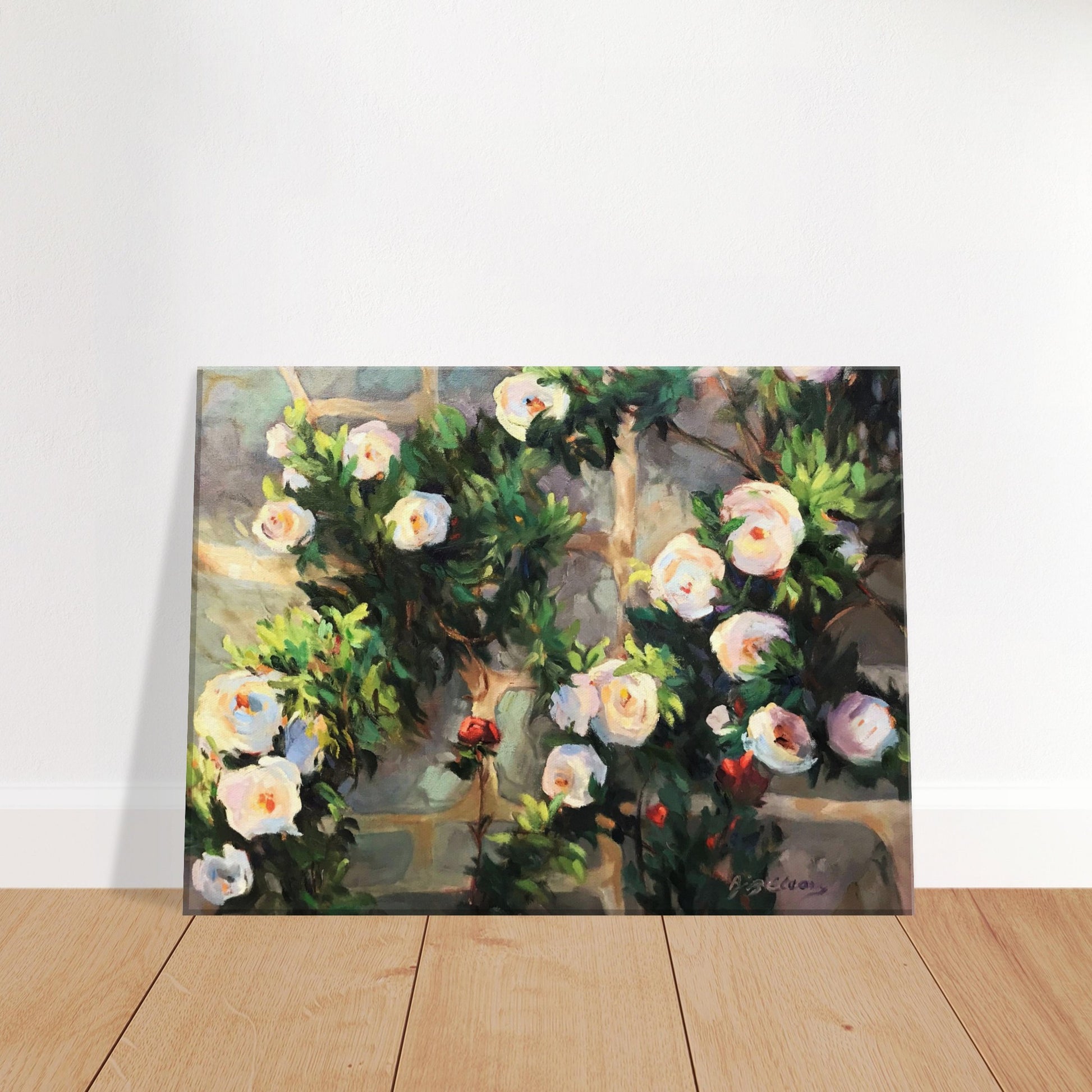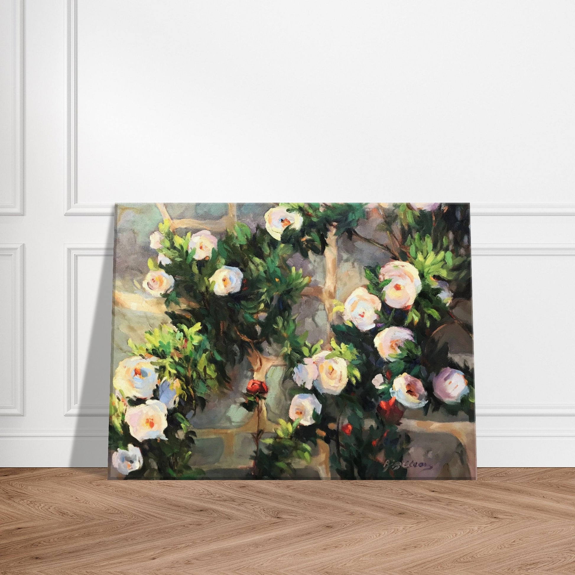 Experience enhanced texture and timeless beauty with our canvas print of Barbara Cleary's floral oil painting, "Vining Roses." The canvas texture enhances the image's natural look and feel, creating a truly immersive art experience.